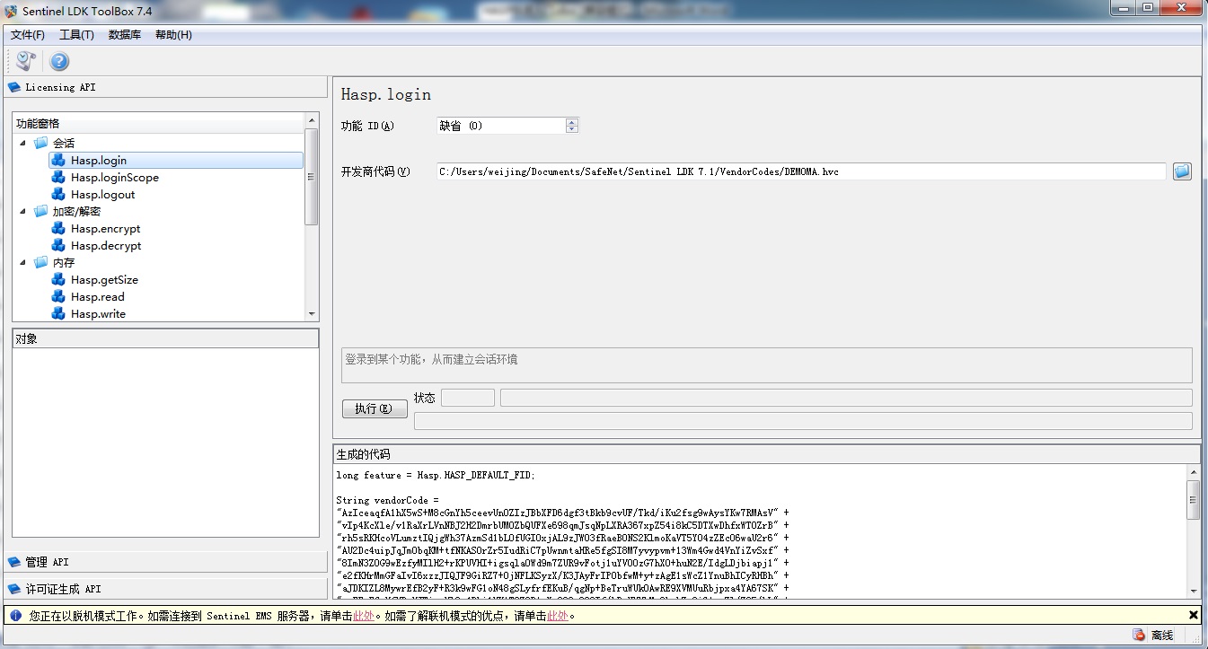 在Sentinel Ldk開發(fā)包安裝目錄C:\Program Files (x86)\ Thales\Sentinel LDK\Samples\Licensing(LDK9.0之前是\Runtime目錄)下有對應的開發(fā)語言的完整示例,這些示例編譯以后,可以直接通過demo號的加密狗來調用測試,示例目前覆蓋主流的開發(fā)語言。如果用正式開發(fā)鎖來調用這個demo程序,需要做一些修改工作。