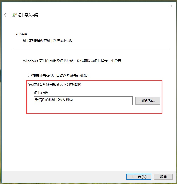 3、選擇“將所有證書放入以下存儲中(Place all Certificates in the following store)” > 點(diǎn)擊“瀏覽” > 選擇“受信任的根證書頒發(fā)機(jī)構(gòu)(Trusted Root Certification Authorities)” > 點(diǎn)擊“確定” > 然后點(diǎn)擊“下一步”;